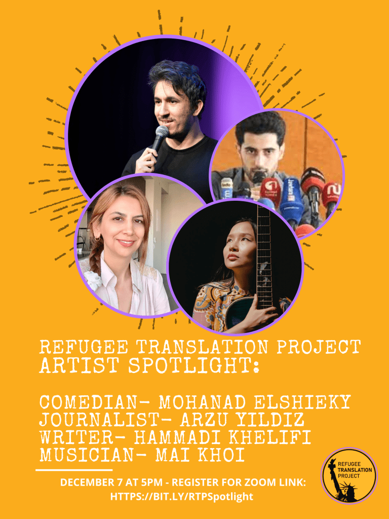 Our amazing and inspiring lineup also includes comedian Mohanad Elshieky, journalist Arzu Yıldız, and writer Hammadi Khelifi. Mohanad will treat us to his hilarious standup. Arzu Yıldız will share her bold work and talk about the cost of freedom after she lost everything for reporting on government corruption and illegal arms dealing in Turkey. Writer and activist Hammadi Khelifi will talk about his writing during the Tunisian uprising.